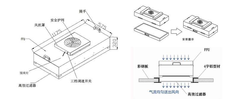 風(fēng)機(jī)從FFU頂部將空氣吸入并經(jīng)高效過(guò)濾器過(guò)濾,過(guò)濾后的潔凈空氣勻速送出;具有低耗能、高靜壓、可謂風(fēng)速、運(yùn)行成本低特性。
