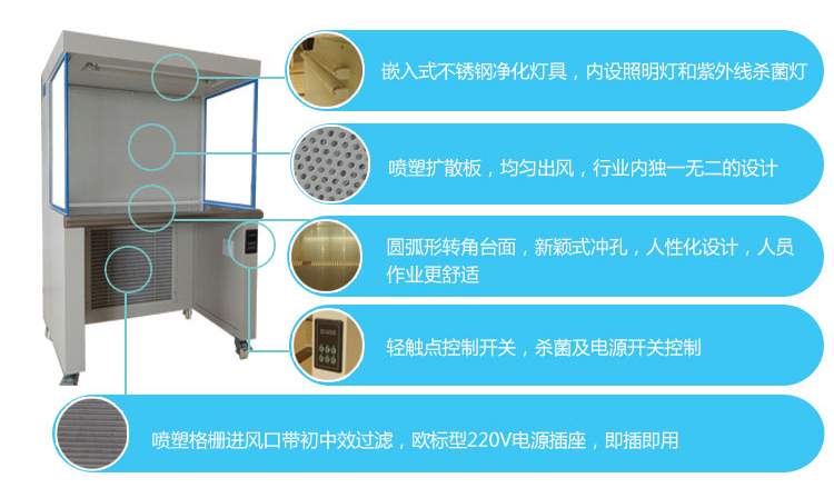 箱體1.2mm軋鋼板烤漆,臺(tái)面SUS304 1.2mm厚度不銹鋼(可訂做全不銹鋼超凈臺(tái)) |